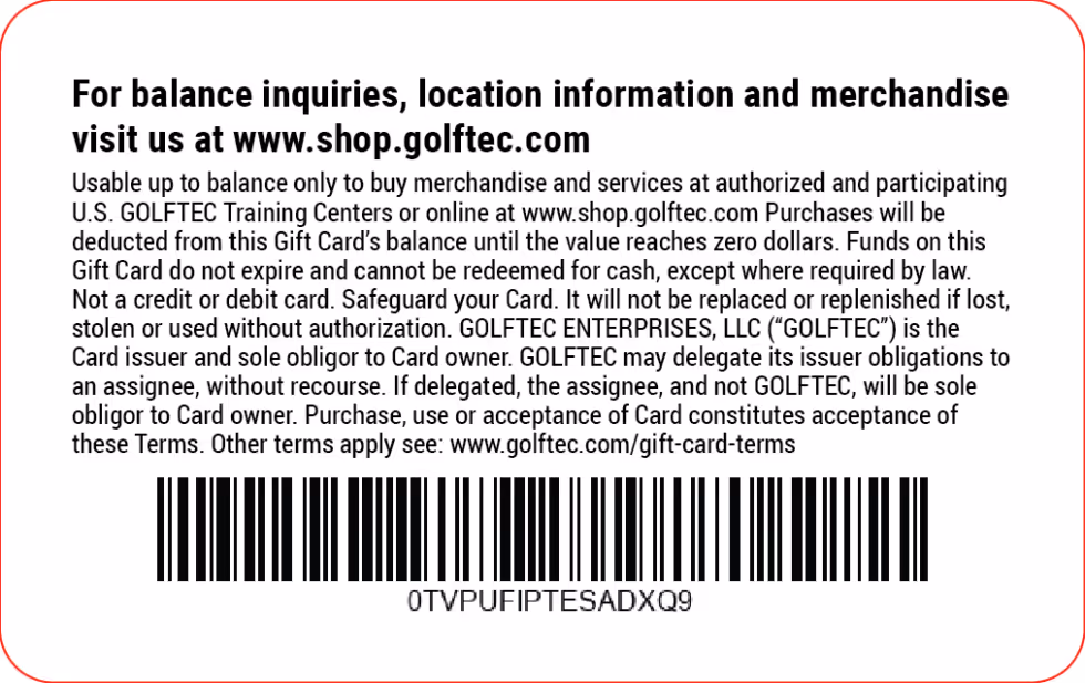 CARD TERMS AND CONDITIONS: Usable up to balance only to buy merchandise and services at authorized and participating U.S. GOLFTEC Centers or online at shop.golftec.com. Account required for redemption at participating GOLFTEC Centers or online. Card has no fees or expiration date, not redeemable for cash, except where required by law. Not a credit or debit card. Safeguard your Card. It will not be replaced or replenished if lost, stolen or used without authorization. GOLFTEC ENTERPRISES, LLC (“GOLFTEC”) is the Card issuer and sole obligor to Card owner. GOLFTEC may delegate its issuer obligations to an assignee, without recourse. If delegated, the assignee, and not GOLFTEC, will be sole obligor to Card owner. Purchase, use or acceptance of Card constitutes acceptance of these Terms. For balance inquiries, locations and merchandise visit: shop.golftec.com. Other Terms Apply see: policies.golftec.com .